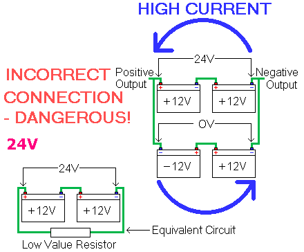 Why are the not recommended situations dangerous? Firstly, if any one of the batteries in the two bad situations above were accidentally connected the wrong way round, it would cancel out the voltage of the battery in series with it, making them both appear like a low value resistor. This means that one side of the batteries would be 24V above the other, which would make a large current flow, in the wrong direction through one (or two if a 36V system) batteries. There's a big chance of a fire, and damage to one or more of your batteries. The diagram below should give you the idea.