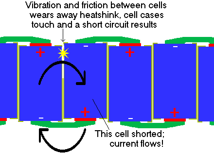 Without proper spacing we have a similar situation to the second dangerous one above, but worse - there will be a chain reaction effect as the heat generated by the shorted cell melts the heatshink on those OK cells nearby, causing them in turn to short, meanwhile the other (unshorted) packs are dumping current into the pack with the short... The remaining OK cells in the damaged pack are soon overcharged, and their terminal voltage then drops, encouraging even more current to flow into the damaged pack... You soon get a fire, as the Kan Opener team demonstrated at Louth!