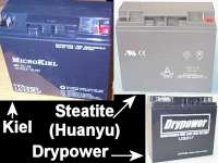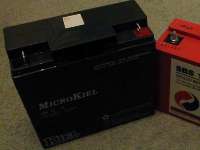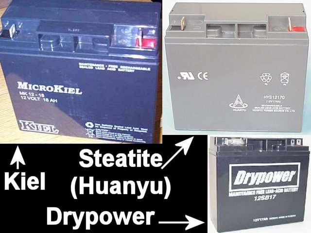 Steatite and MicroKiel (Kiel) - I lump these together because I am almost certain that these are the same battery - if they did not come from the same factory, then they are certainly the same design! I have seen at least five different names on exactly the same battery case (in dark grey, light grey and bright orange) used in robots from the UK and USA. On paper their specs are good, but the main advantage they offer is cost - even brand new, they're very cheap! Both ourselves and Chaos 2 used Kiels at Extreme, and Bigger Brother has also used Kiels. These are also lead calcium batteries.