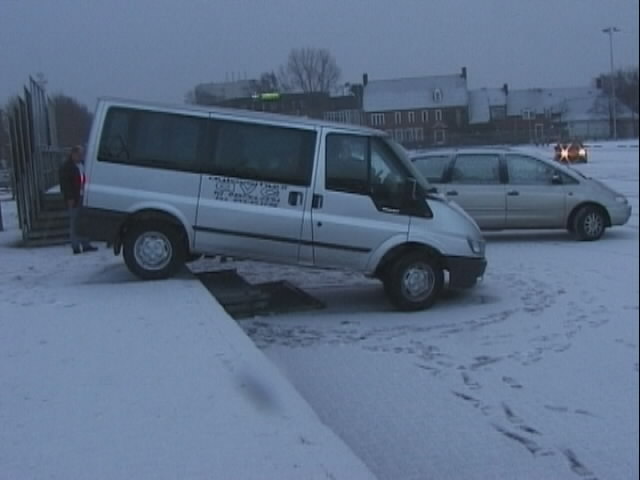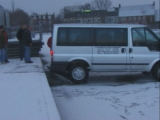 The morning of Saturday dawned early and bright - but cold! And was it cold - according to a temperature display in Zwolle, it was minus 6 degrees and by the end of the day it had risen to - minus 3 degrees... Breakfast was served at the hostel, and the coach took us back to the IJsselhallen in Zwolle, in preperation for the days combat. In the car park at the IJsselhallen, one of the exhibitors in his hired van had tried to take a short cut out of the hall, and failed to spot (or at least failed to stop at) the concrete step... check out the dent in the sill!