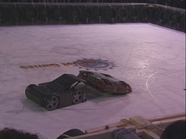 Our first fight of the UK competition was against Roobarb. We did our usual trick, pushing them about until we broke one of their gearboxes and immobilised them.