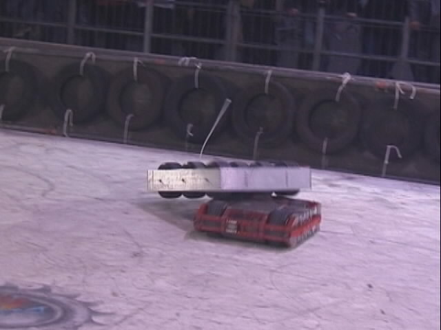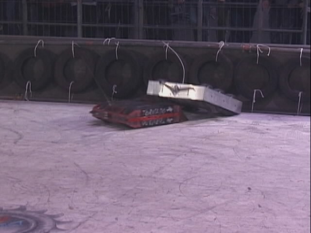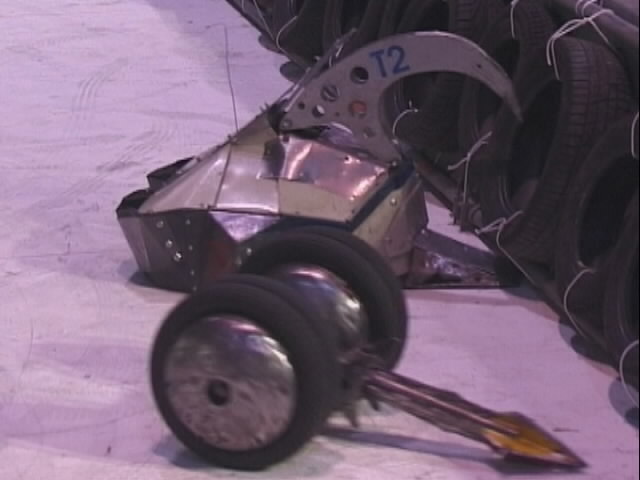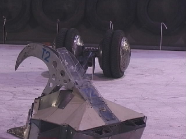 Stinger got stuck in with Tiberius 2. Tiberius got a good crush in on one of Stingers wheels, but it's crushing arm bent before Stinger was damaged!