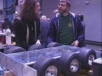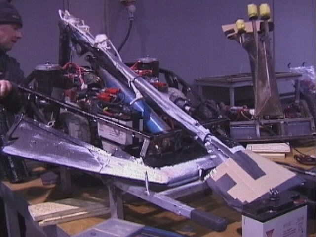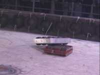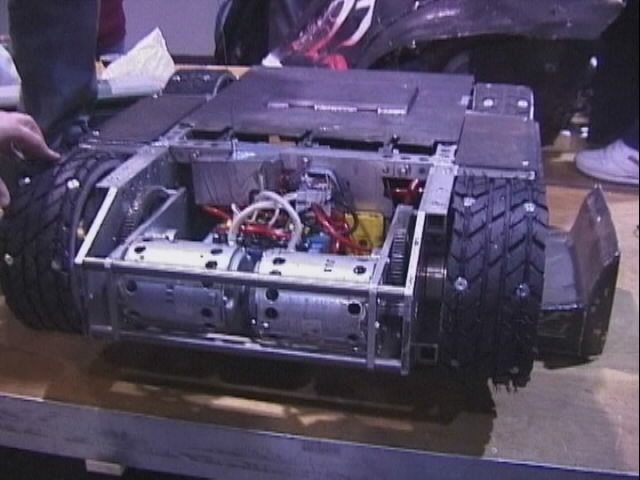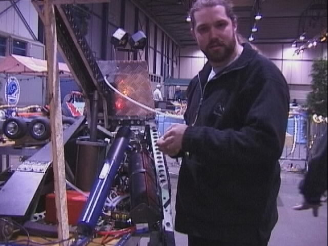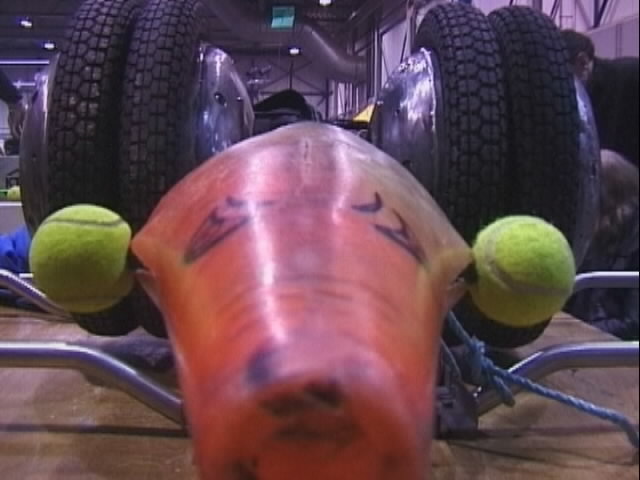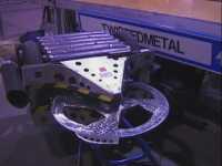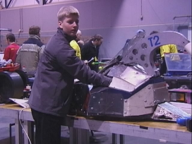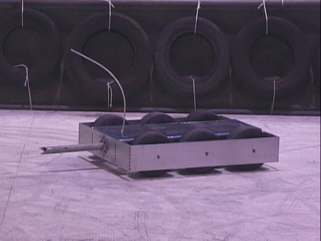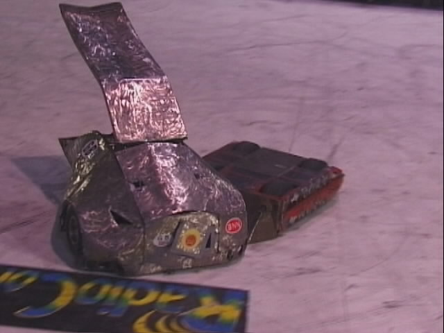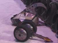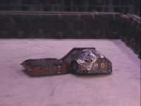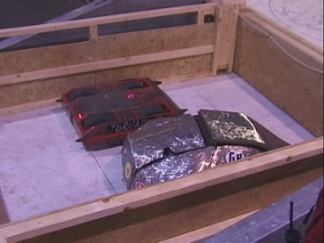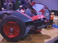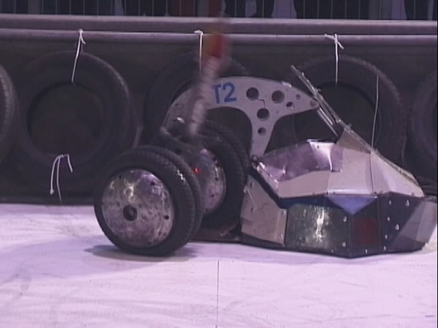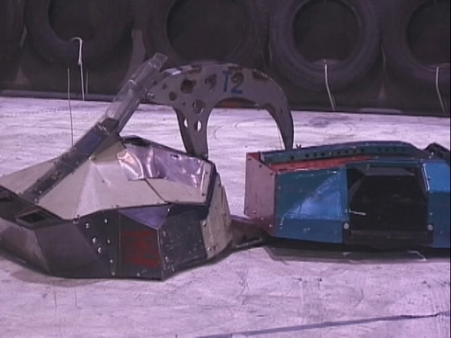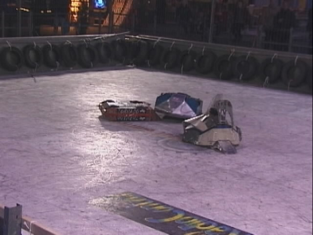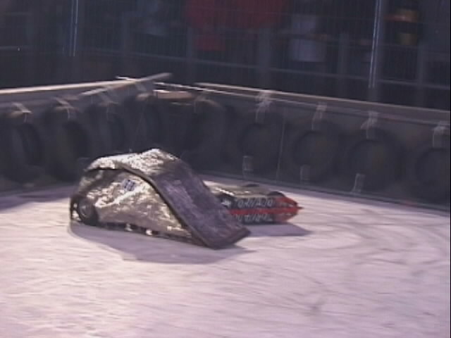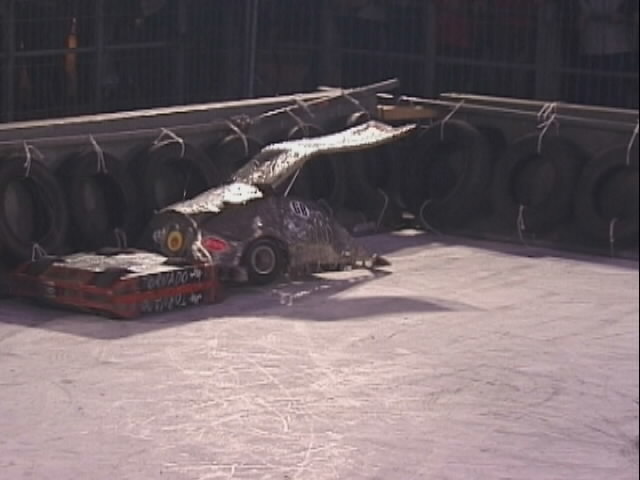 We fought Wolverine and T2 in the UK competition final. Don had intended to run the final as three 2 way play-offs, but there was just not enough time, and his crew were dithering about and not making a decision. So we just threw all three robots in and got on with it... We spent far too long in the fight trying to stage a crush between ourselves and T2, such that when it came to the end of the fight and a crowd decision, only Wolverine had been doing anything that remotely looked like attempting to win the fight! Thus the trophy was deservedly awarded to Gareth Dean and Wolverine. Dave said it was noticeable that something strange was going on, I know by this point I was pretty tired and not thinking all that straight...