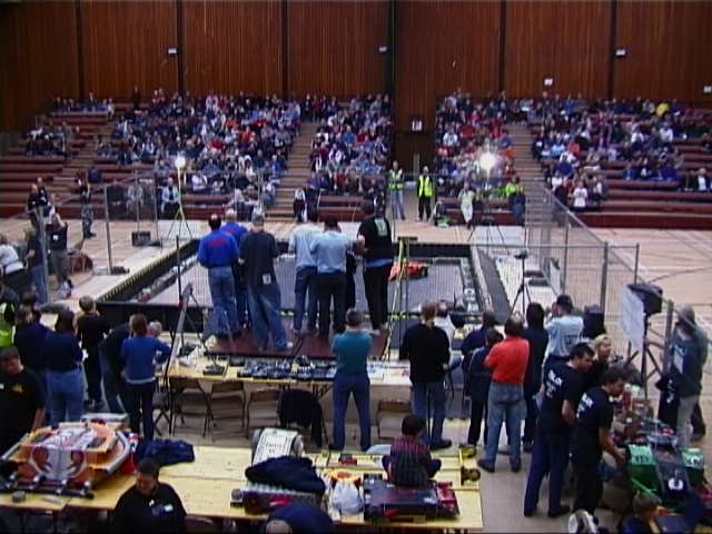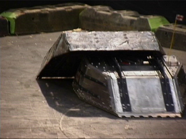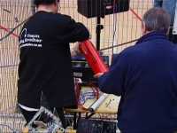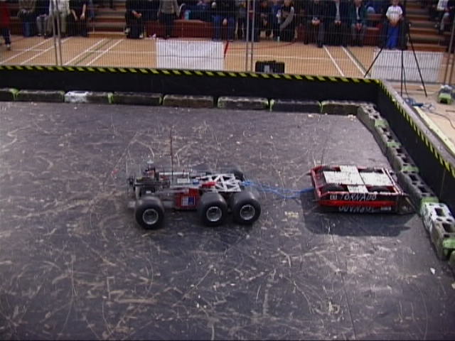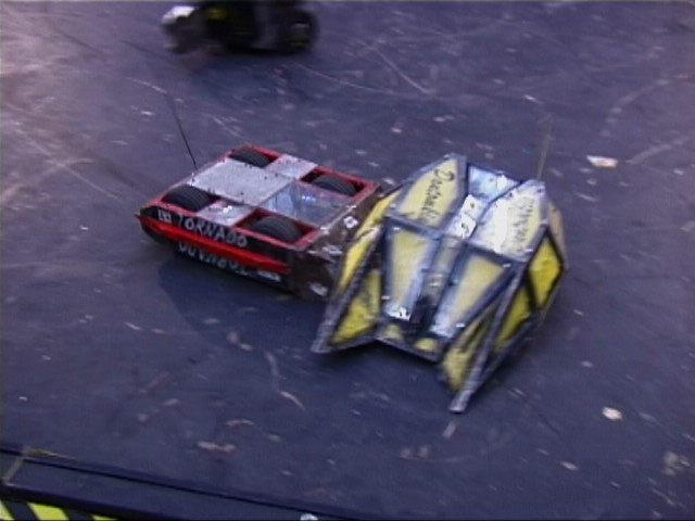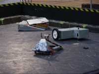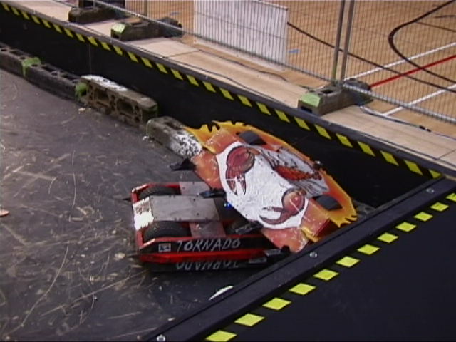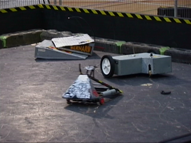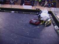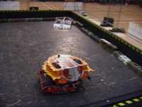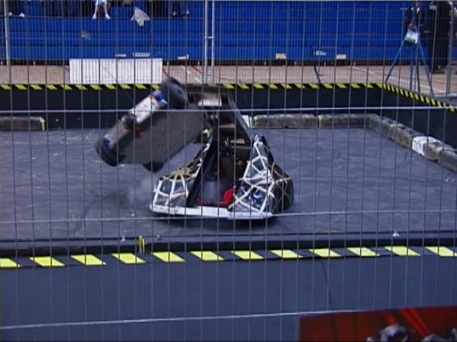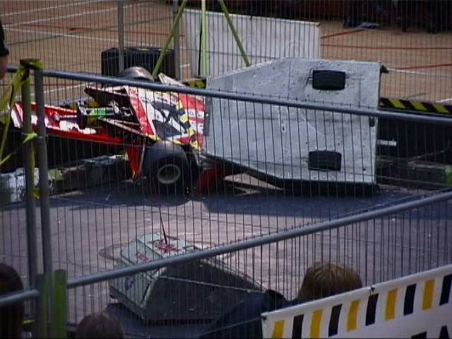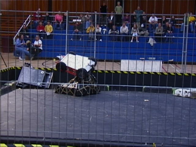 In the first session we ran against Dantomkia (driven by Steve, as Mike was busy organising) and Pussycat. Dantomkia managed to get underneath us once, but had a problem with their flipper, and we were able to drive off again. The judges and crowd were asked their verdict, and we were given the fight.