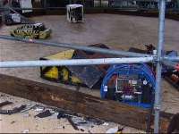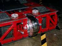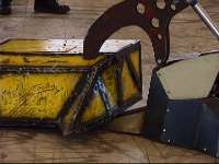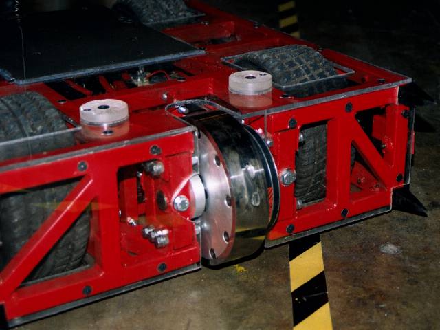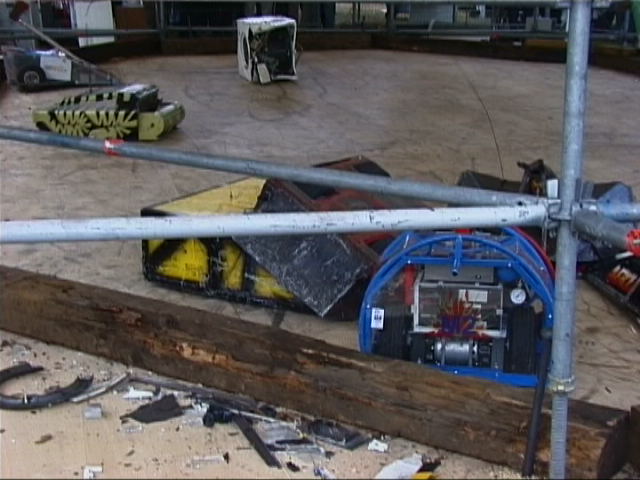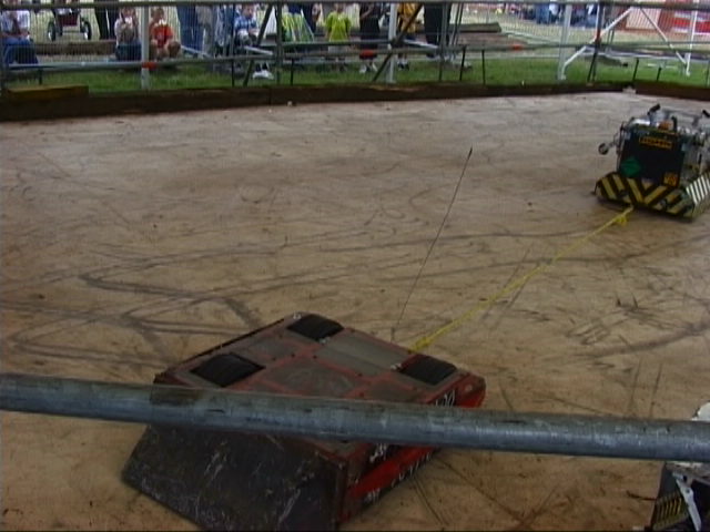 1/7/01 - Fifth and final day of Robot Wars Extreme filming. We intended to get in early to remove all the charity event parts and refit the spinning disc and proper armour, but I overslept because for some reason the phone in my hotel room stopped working and I missed my wake up call... We still got in soon enough to do what we needed to though, and we were ready for our first round World Championship fight (a four way Melee) just before lunch. We were to be against Panzer Mk2 from America (a very powerful pushing robot with a lifter), Philipper from Belgium (with two lifters and a self-righter) and Yebo Robo from South Africa (with an axe and chain lifter). Ourselves and Panzer were ready and went out into the arena, and waited. And waited. Yebo Robo was having problems, so the fight was postponed until after lunch! Yebo Robo was fixed over lunch, and once everyone was back out again, the fight commenced. I say out rather than in position, because both Philipper and Yebo Robo did not get to their start points! We had already realised that Panzer were going to be the difficult opposition, so we went straight for them. We soon found how difficult - they are the first robot that we have failed to push, and once they got their lifter underneath us, they could push us around at will. We managed to make a real mess of their side bars with our disc, but we could feel the battle slipping away from us ... until Philipper sneaked up behind Panzer and turned them over! Panzer's self righter failed, so we proceeded to have some fun. There was not a lot we could do to Philipper, but as it wasn't that quick, we pushed it about as best we could. Yebo Robo finally got going, and moved out into the middle of the arena - so we pushed them straight down the now open pit! It was a fun fight, which we won but only with the help of the Belgians, and in which we experienced our only interference problems at the whole event - I think some robots have a bit to learn about suppression!