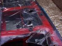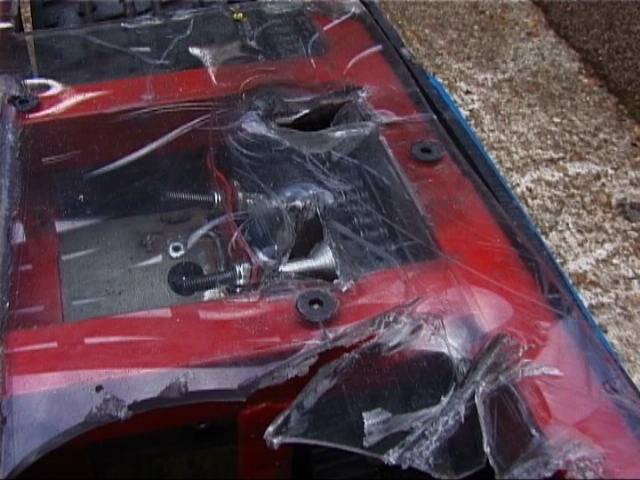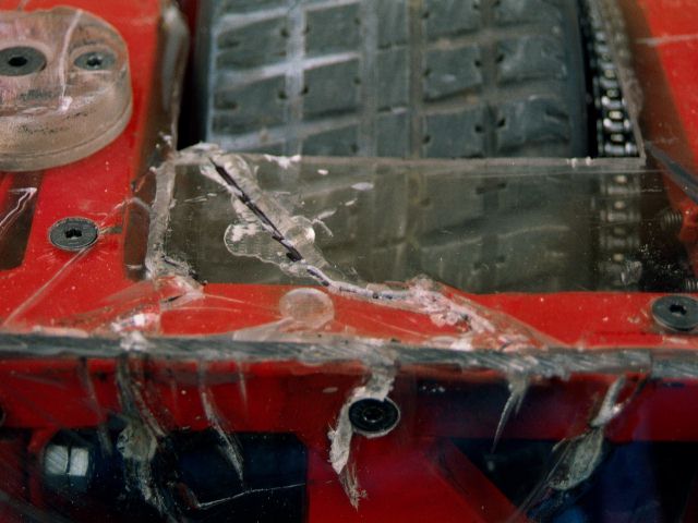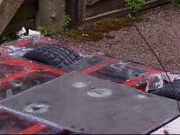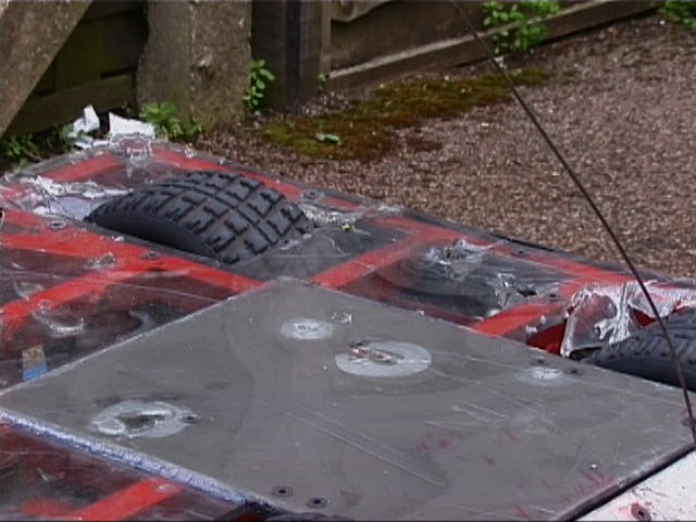 ![]() CLICK ON THE THUMBNAILS TO VIEW A LARGER IMAGE | Back to previous entry - Extreme Workload | 21/6/01 - Annealed the chassis welding, side bars and weapon motor cradle and mounts. Got the Extreme info through from Mentorn (who are cutting it fine, as always). Finished a good chunk of the removable spikes and the chassis bottoming feet. Ordered some more kart chains from Dartford Karting. Armour arrived from Vantico - it looks excellent! 22/6/01 - Kart chains arrived from Dartford Karting - that's seriously good service! Sorted all the tickets for Extreme out. Bryan sorted a load of bits out at work - drilled the spare disc, pulleys and motor shafts. Started drilling the top and bottom armour. Worked on the foam donuts to put in the wheels - the tyres are very hard indeed to stuff, but they are just possible. Made up four wheels plus two spares with wet tyres ready for Extreme. 23/6/01 - Tickets arrived in the post from Mentorn, and we sent those out to people as required. We cleaned the stand and trolley ready for painting, made the spike and weapon guards, hardened all the spikes, toughened the disc teeth, plus drilled and test fitted all the armour. Dave continued working on the electronics - we now have complete speed controllers and almost complete control/decoder boards. You can see our new LED diagnostics board (top right below) - this tells us at a glance what is happening in the controller. ![]() ![]() ![]() ![]() ![]() 24/6/01 - Cleaned the chassis, spike/disc guards, trolley, side bars, weapon mounts and weapon motor cradle, and then painted all this lot! ![]() ![]() ![]() ![]() ![]() ![]() ![]() ![]() ![]() ![]() ![]() ![]() 25/6/01 - Stickers arrived from Applied Lettering. Handed out the rest of the Extreme tickets. Labelled up the new side armour in the evening, and finished off a few details. ![]() ![]() ![]() ![]() ![]() ![]() ![]() ![]() ![]() ![]() ![]() ![]() ![]() 26/6/01 - Sorted out the chassis bottoming feet problem by adding another bolt so they cannot spin and unscrew. Finished the final few spares, and packed the 101 ready to leave for Extreme tomorrow. We finished at about quarter past midnight... 27/6/01 - The first day of Robot Wars Extreme filming at Earls Court in London. It was a very early start for us, not helped by the fact that we had a big thunderstorm in the early hours of the morning and none of us got much sleep. We met up with Bryan at South Mimms services, where he was catching up on some sleep on one of the stretchers in the back of the 101! We got to Earls Court early, before even the car parks were open, and had to kill a bit of time. When finally we got into the grounds of Earls Court we still had to wait, as they crew hadn't arrived and we couldn't be let in. Once we got in and unloaded, it was clear that a few things were different from the Series 4 filming. The pits area was very small, it was only possible to get round two sides of the benches (so working on the robot often required someone to be standing on the bench!), and some poor sods had to share benches that were barely big enough for one robot as it was. We weighted in at 97kg and were ready to fight by 10.30am. ![]() ![]() ![]() ![]() (Hires versions of some of these images are available in the Gallery.) 28/6/01 - Second day of Robot Wars Extreme filming - everything was falling really far behind by now, and Mentorn began cancelling events - the Challenge Belt which we were due to be taking part in tomorrow (Friday) was cancelled until the Series 5 filming in August. Mentorn decided today that they wanted us to fight 3 Stegs to Heaven in the All Stars as planned, so the Stinger fight would have to be put down as a grudge match - except we've never fought them on TV before... The fight against 3 Stegs went very well, despite their new spinning weapon - we pushed them around a lot, cut some good scrapes in their aluminimum armour, and broke both their wheel bearings(!), making them loose a chain on one side. We went through - the Steg guys have some improvements planned before Series 5. The photo below shows a little bit of damage to our front armour - and some paint from 3 Stegs! ![]() ![]() ![]() ![]() 29/6/01 - Third day of Robot Wars Extreme filming - things were so far behind now that Mentorn were forced to cancel yet more events, including the Melee we were due to compete in on Saturday (tomorrow). Our first fight of the day was our semi final fight against our old adversaries, Chaos 2! This was the first time we were to come up against them with the new weapon, and only the second time on TV - it was time for revenge! We pushed Chaos all over the place, taking chunks out of his covers and aluminium sides. Although George got a few flips in, we kept going, and Chaos started to fade, Georges flipper loosing power and failing to return properly. At one point we pushed Chaos into a CPZ, but then we got pushed onto the side of the arena and attacked by the house robots! It was a good test of our new titanium laminated armour, as Shunt's axe barely marked it; see the picture on the left below. We were knocked off the side by Refbot and the fight continued; then Chaos 2 lost drive on one side and the fight was effectively over. Although it went to the judges, they ruled that because we had pushed Chaos into the CPZ that the house robots should have attached Chaos 2 and not us, so we won and were through to the final! Chaos 2 was a bit of a mess - we managed to hit their gas bottle (but not punture it), and we broke one of their wheel bearings, which is what caused them to loose the chain. When George lifted the flipper on the bench, it returned fine - Ian and George took Chaos 2 back to Ipswich for repairs. ![]() ![]() ![]() 30/6/01 - Fourth day of Robot Wars Extreme filming. We got to Earls Court as early as we could to build Tornado up to go to Robots@War (Wilsons Day). Before we left Earls Court, we were told that we had been given a place in the World Championships to be f