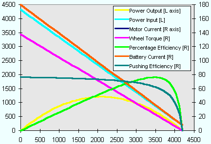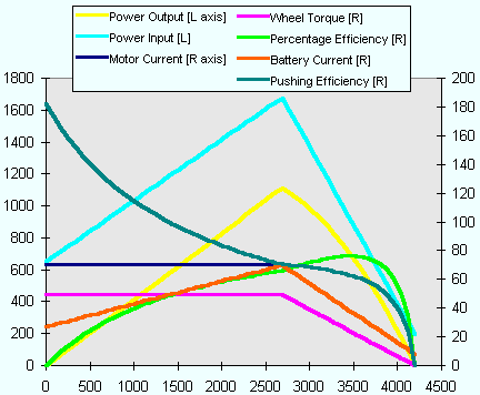 ![]() ![]() ![]() ![]() ![]() ![]() ![]() ![]() Motor Current and Battery Current (amps) Because there is no current limit, the motor current and battery current are the same. The current varies linearly from the maximum at zero rpm (when the motor is stalled), to the minimum at maximum speed (no load). It never reaches zero, because all motors have losses in the bearings etc, and these require power to overcome. Power Input (watts) This is simply the input current multiplied by the applied voltage (which is a constant 24V) - therfore as expected it's shape follows the current curve. Here the power input at stall is a massive 4400W, well above the motor's 750W rating! Wheel Torque (newton-metres) As torque is proportional to motor current, again this tracks the current curves; it is maximum at stall (0 rpm) and minimum at off load (4200rpm). The torque here is the torque at the wheel, i.e. multiplied through the gear ratio shown in the motor input field (green in Figure 1). It gives a good idea of how much pushing/acceleration force each motor will contribute. Power Output (watts) The power output of the motor is torque times speed - two quantities that are changing in opposite directions - as speed goes up, torque goes down. This is why the peak power output is always at half of maximum RPM (provided there is no current limit). It can be seen that the peak power output is considerably more than 750W - actually more like 1200W, that's 1.2kW. Note that the curve is always less than the power input, and the difference between the two is the wasted power - heat! Percentage Efficiency (percent) This is simply power output divided by power input. There's always power lost as heat in the windings, it's unavoidable. The more efficient a motor is, the longer your batteries will last and everything won't get as hot! It's always zero at stall and max rpm. Pushing Efficiency (newton-metres per amp) This is a fairly arbitrary curve, and only should be used to compare motors (setup using the same target speed and wheel size) when the choice between them is getting difficult. It's a measure of the torque produced by the motor for the current taken from the batteries - similar to the torque constant of the motor (one of the fundamental parameters that define a motor), but this takes into account the gear ratio, and any current limiting if present. ![]() ![]() ![]() ![]() ![]() Motor Current This curve follows the battery current when the rpm is high enough that the current limit is not operating. But because of the current limit, it cannot rise above the current limit that has been set. Thus for a substantial chunk of the rpm range of the motor, it will operate in current limit. (But remember - the motor is only going to be in current limiting if it is fully loaded!) Battery Current (amps) You would expect this to be the same as the motor current - but while the current limit is operating, it is not. All PWM speed controllers that have current limiting operate in an efficient way that minimises power losses, called "switch mode" operation. You might find this quite a hard concept to understand - for this worked example, please just accept that it is correct! Power Input (watts) As before this is the input (battery) current multiplied by the applied voltage - but because the battery current drops at low rpm, the input power drops too, here to about 650W. This characteristic is what makes it much harder to burn out a stalled motor when you have a current limit. The peak power input is also much lower than before, it's only about 1700W - and look where it appears, at the same rpm as the maximum output power, and the same point that the motor comes out of current limit. It's not a coincidence! Wheel Torque (newton-metres) As torque is proportional to motor current, this tracks the motor current curve as before; it has a flat maximum at all speeds that the motor is in current limit. The maximum has dropped from that without the current limit; thus it can be said that the current limit directly affects the wheel torque. Power Output (watts) The power output of the motor is still torque times speed - but as the torque is lower (and constant) through most of the rpm range (while in current limit), the trace is linear rather than curved. The peak power output is still a relatively high 1100W, but it's no longer at half rpm. The most interesting comparison is the difference between power input and output - in this case it's never more than about 700W, and that's a huge difference to the unlimited case. Percentage Efficiency (percent) The current limit has helped to skew the efficiency - it's better at low rpm than it was before. It's the same observation as the relative difference between the input and output powers - less power is being wasted as heat. Pushing Efficiency (newton-metres per amp) This shows one of the real merits of current limiting - the pushing efficiency is greater while in current limit, because the battery current is dramtically lower. But it doesn't mean that this option will make the robot using it able to push more - the reduction in wheel torque is more important in this respect. ![]() ![]()