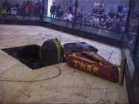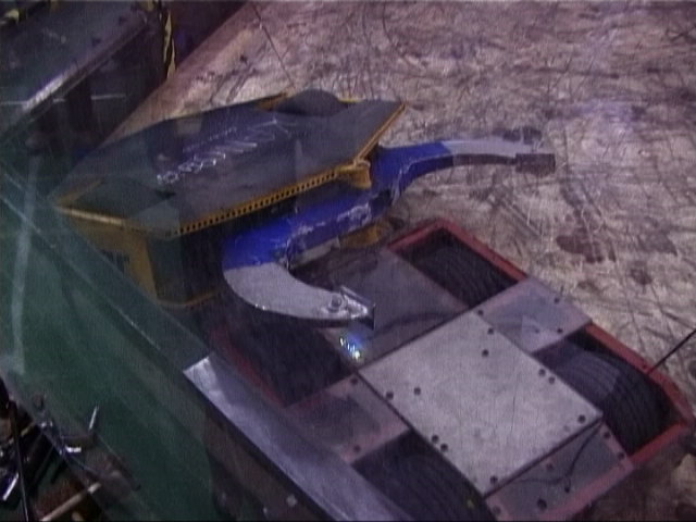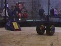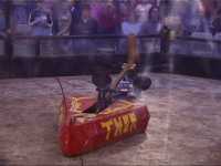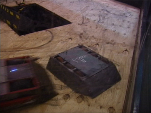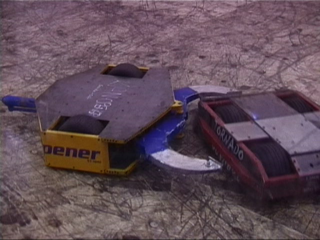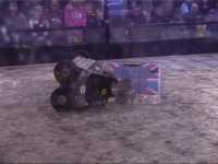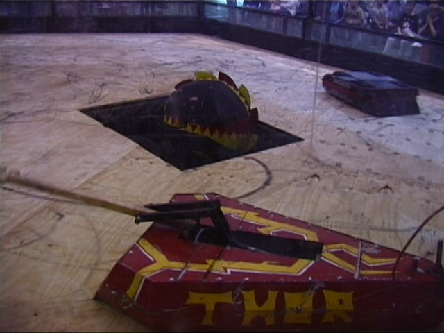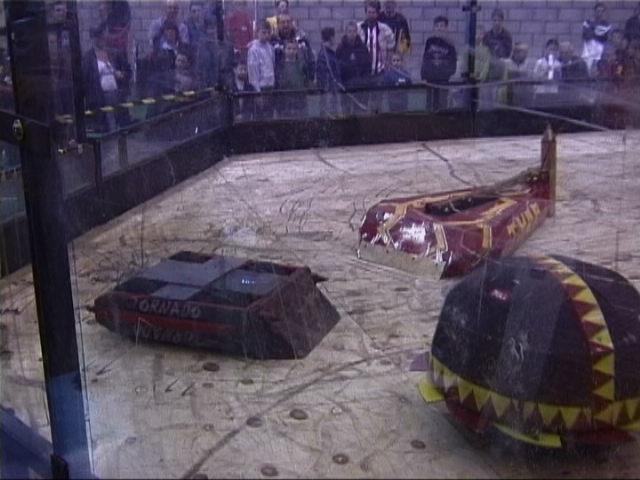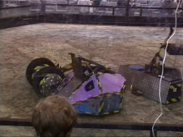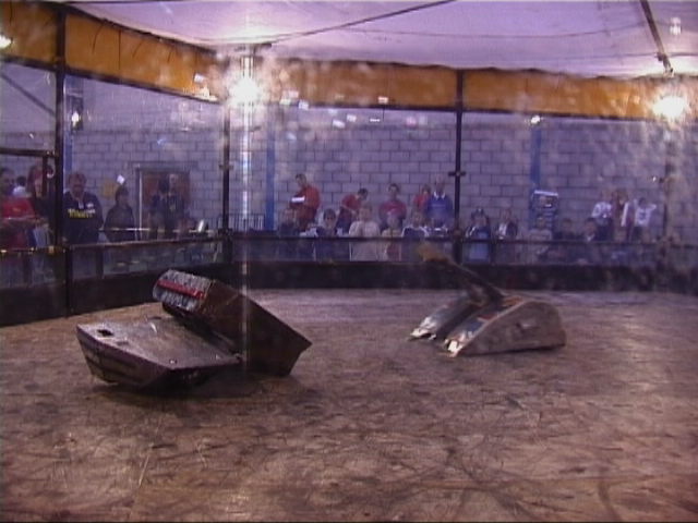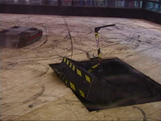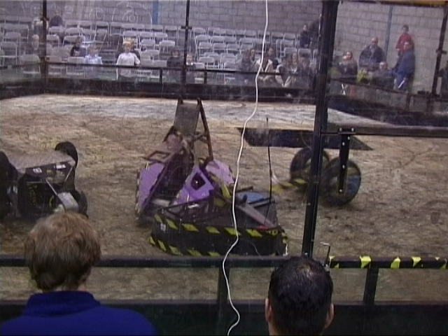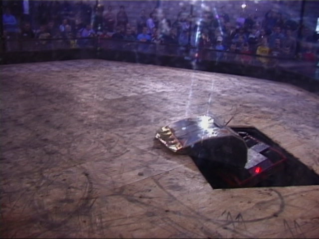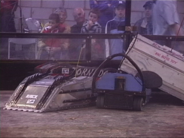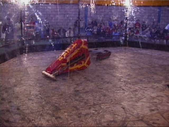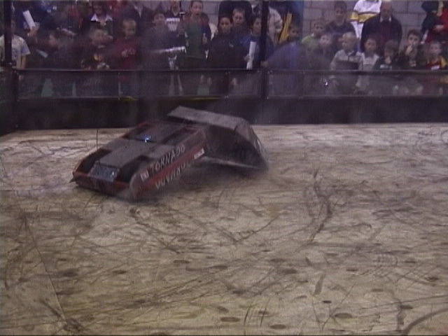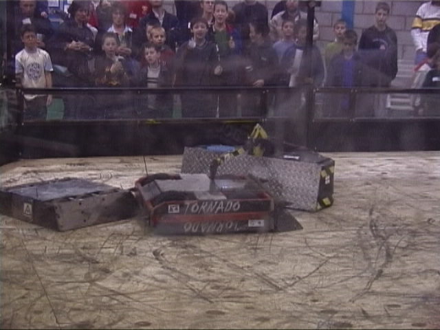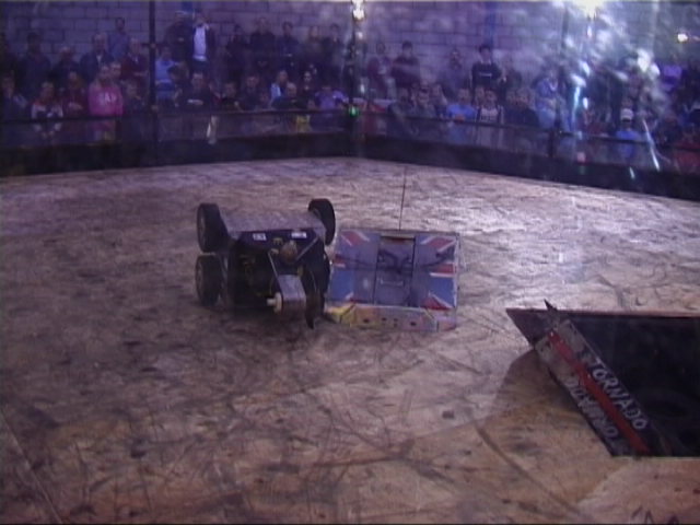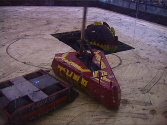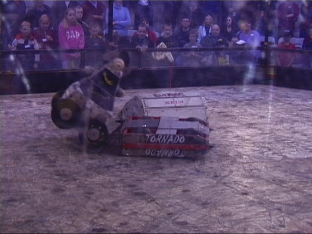 Our first fight of the afternoon session was against Dantomkia. They "racked and stacked" Tornado on its side against the arena wall, righted us again, and then Mike drove down the pit!