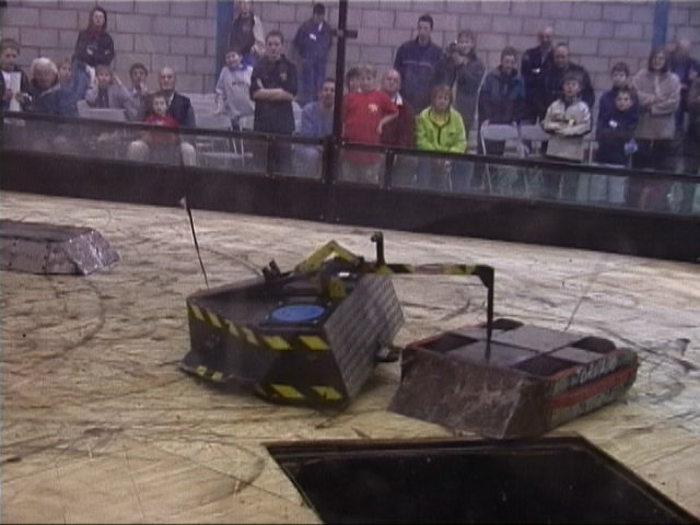 Humphrey soon gave Tornado a puncture, and managed to wedge its axe into a gap between our armour panels. Not wanting to get peppered by their axe like happened before at Worthing, we tried to put them in the pit, but there was no need in the end, because Mick drove Humphrey in unassisted!