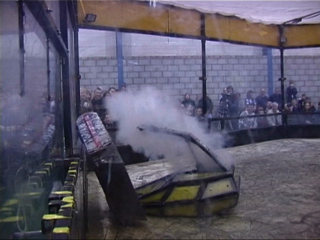 We then got into a shoving match with Storm II - they had less traction on the uneven floor surface and we were able to push them about, despite the large amount of tyre smoke they were making! We were awarded the fight. Storm 2 needed a bit of attention to its wedge afterwards...