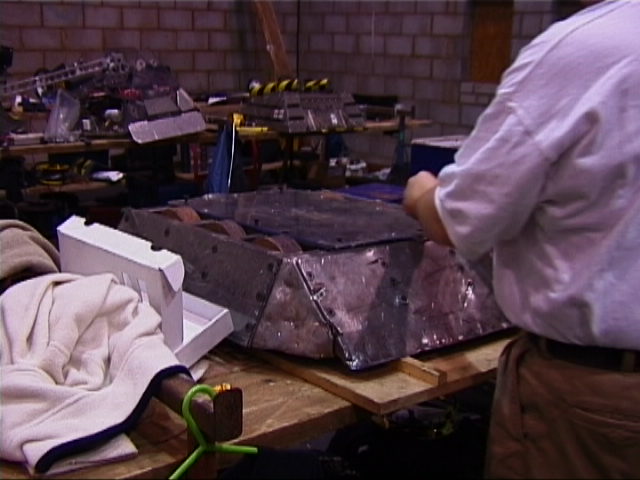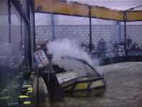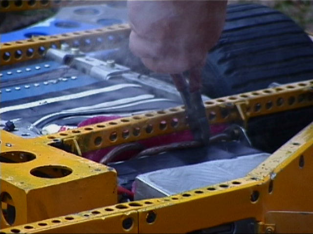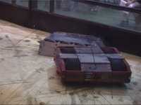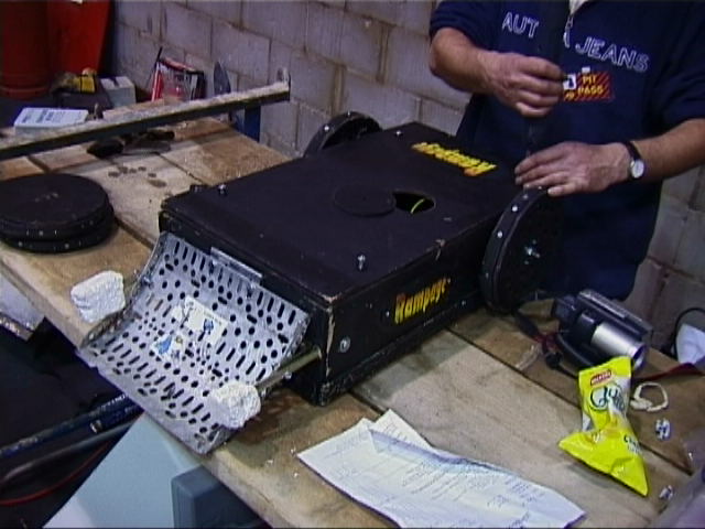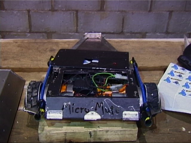 Once the lid was off, it was obvious that it was too late - the nicads were toasted. What went wrong? Well, their packs had been simply stuck together with cyano, so the cells were physically a lot closer together than they should have been. And they were charging them all in parallel, from a bench power supply - two things that you should not do! It is likely that one cell shorted/overheated/failed, probably through overcharging, and then the power supply and other packs in parallel dumped power into the weakened pack. This overheated the cells, causing the heatshink to fail, and more cells to touch one another and short... A bit of a chain reaction! It's one of the dangers of using nicads - you have to be careful, meticulous and do everything properly - no cutting corners. Kan Opener itself was undamaged however, and was able to continue fighting, but using its original Hawkers! Kan Opener didn't have to feel alone though - Micro Mute had a similar smoking nicad problem during one of the feather fights...