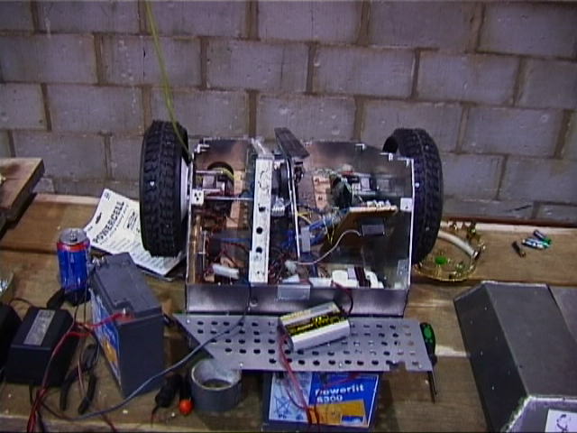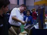 There were two power outages in the afternoon. When the lights went out, lots of torches appeared - from the roboteers of course! We ended up using our Hawkers and John Reids light bulbs (from his nicad discharger) to provide lighting for the crowd. The local electrician was called, and it turned out that there was an earth fault on the outside lights, which was blowing the main fuse...