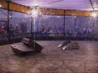The Roaming Robots arena was coming along pretty well, so we unloaded the robots from our cars. Time was getting on though, so we decided to find food, and went into town to a little pub. We had been given an invite to the climax of the school's "Mega Day" - an Irish Ceilidgh held at the town hall - and it turned out that the pub was just round the corner from the town hall. So we called in - the doorstaff were expecting us, so things looked good. But when we got upstairs, it turned out not to be what we were expecting - Abba was playing, and we had walked into a school disco! Not that there was anything wrong with that... just we were tired, and it wasn't what we were expecting! We didn't stay long at all, and returned to the Sports Centre.